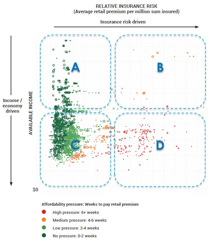 This shows the average level of affordability pressure across 3000 Australian postcodes; sum insured is reflected by circle size. 12% of postcodes have medium to high affordability pressure. Areas such as Bundaberg (QLD) and Greater Geraldton (WA) fall into quadrants C and D.